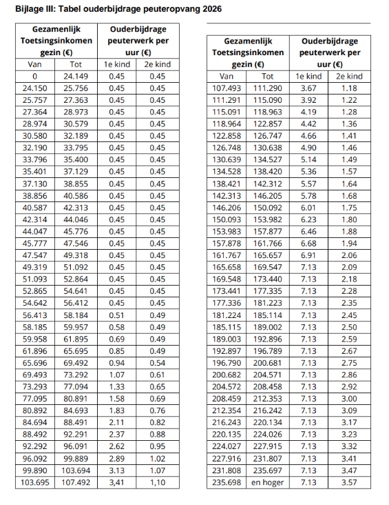 Dan betaalt u een ouderbijdrage voor 2 dagdelen (8 uur) per week. De bijdrage betaalt u aan de peuteropvangorganisatie. De ouderbijdrage is afhankelijk van de hoogte van uw inkomen. In de tabel hieronder kunt u zien wat uw bijdrage per maand is. De bijdrage voor de 40 weken peuteropvang is verdeeld over 12 maanden. U betaalt elke maand een zelfde bijdrage.